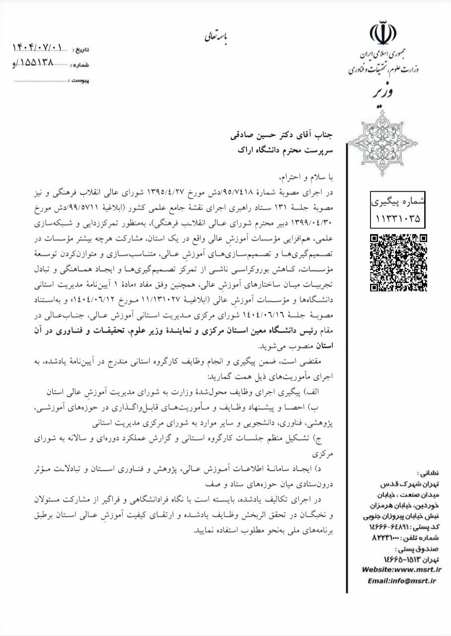 به گزارش روابطعمومی دانشگاه اراک، طی حکمی از سوی دکتر حسین سیمایی وزیر علوم، تحقیقات و فناوری، دکتر حسین صادقی سرپرست دانشگاه اراک به عنوان رئیس دانشگاه معین استان مرکزی و نماینده وزیر علوم در این استان منصوب شد.